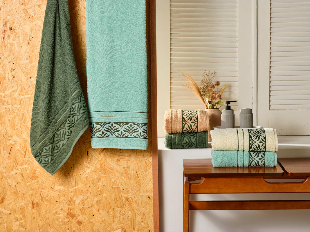 O desenho delicado que imita folhagem confere um charme especial a cada peça do nosso Kit Toalha Sintra. Cada detalhe foi cuidadosamente desenhado para trazer uma sensação de frescor e conexão com a natureza para o seu espaço de banho.